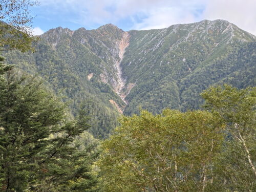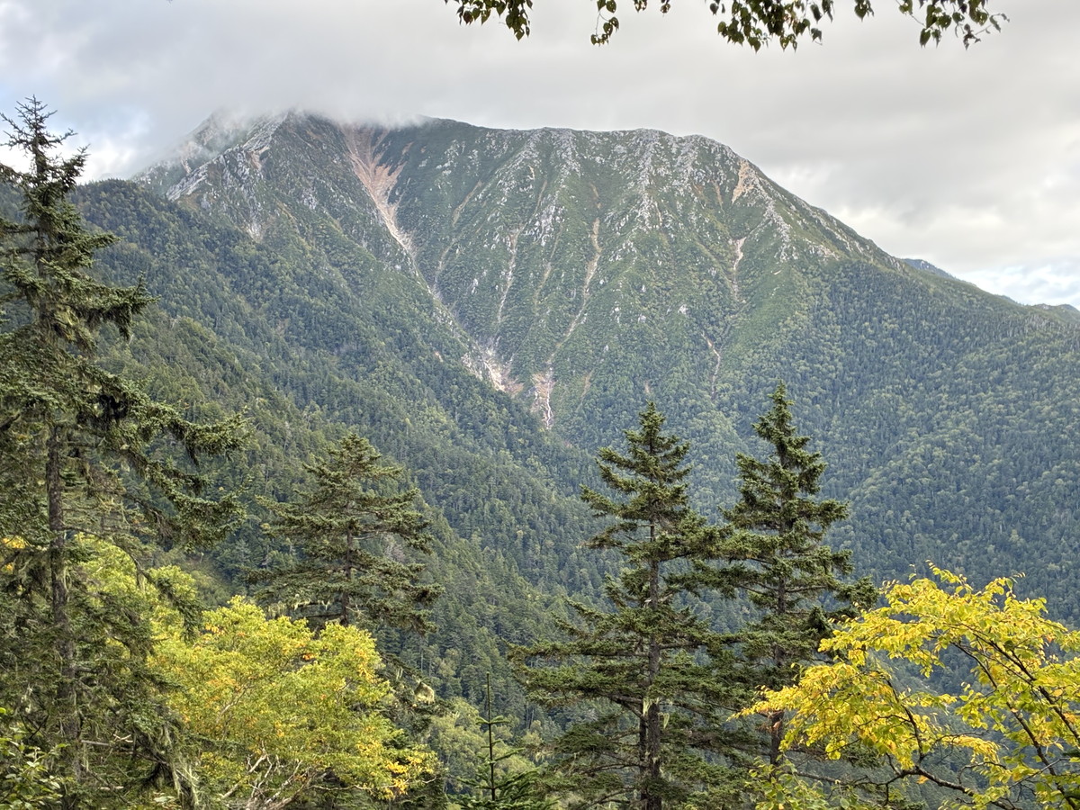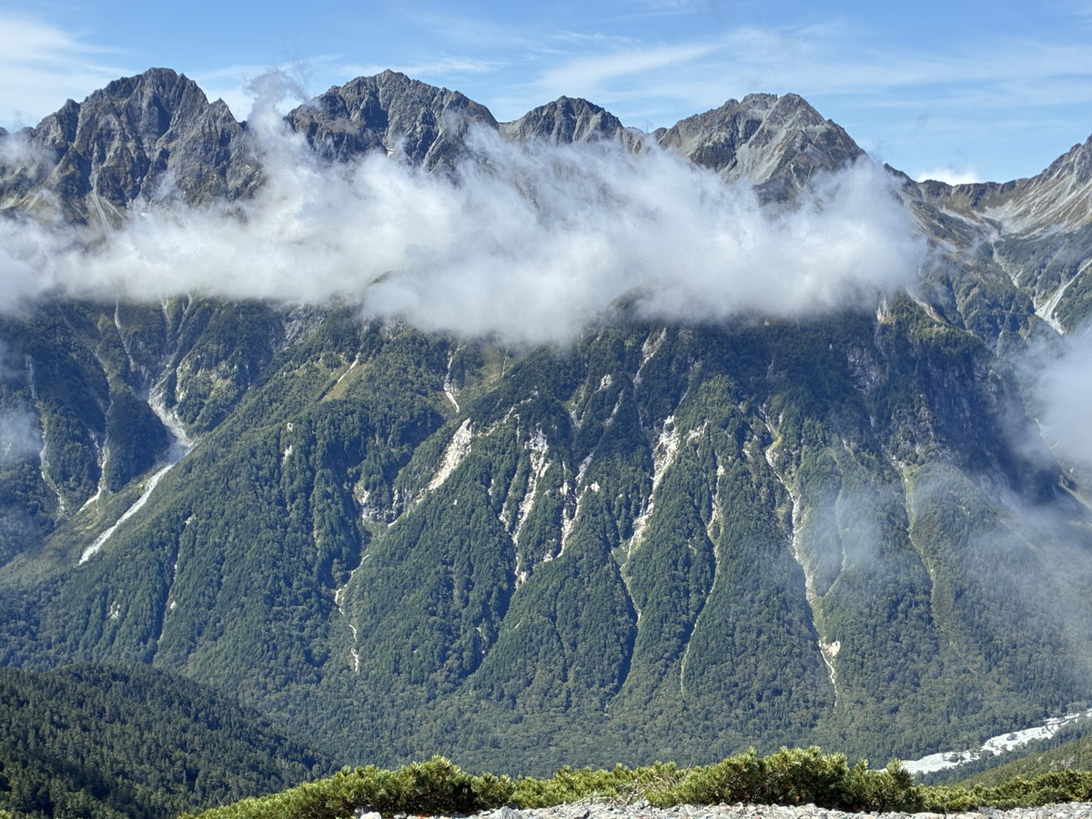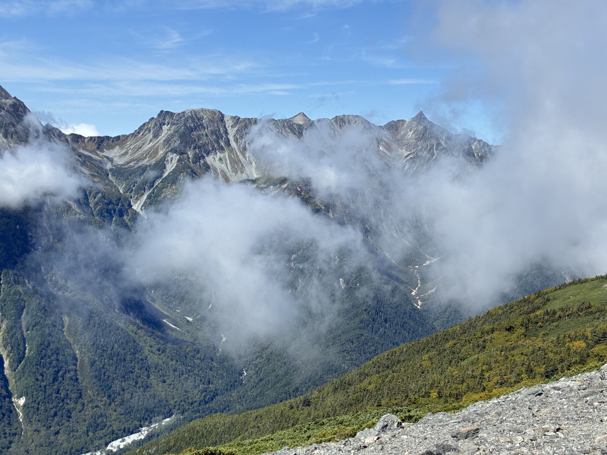 食事をしながら1時間程待つと漸く雲が切れてきました。勇姿を現した穂高連峰。