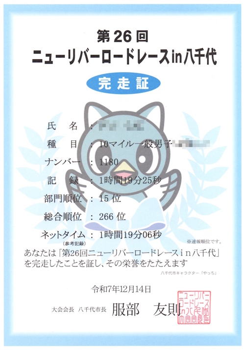 第26回 ニューリバーロードレースin八千代 2025/12/14 マラソン 2025年12月14日 参加3回目のニューリバーロードレースは生憎の雨となってしまいました。記録は更新できましたが、とにかく寒かったです。